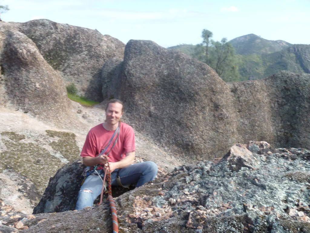 Up and left he goes, finds a great stance and begins the time honored tradition of hand drilling his first bolt in the pinns.
